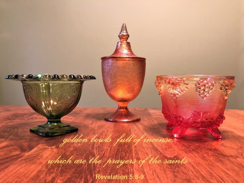 As I reviewed these verses a vision of my colored glass in my home came to mind. I documented my collection of these beautiful vases, bowls and containers in photo. It also leads me to reflect on the colorful imagery of the heavenly throne. As witnessed in the earthly creation – God encompasses beauty and color.